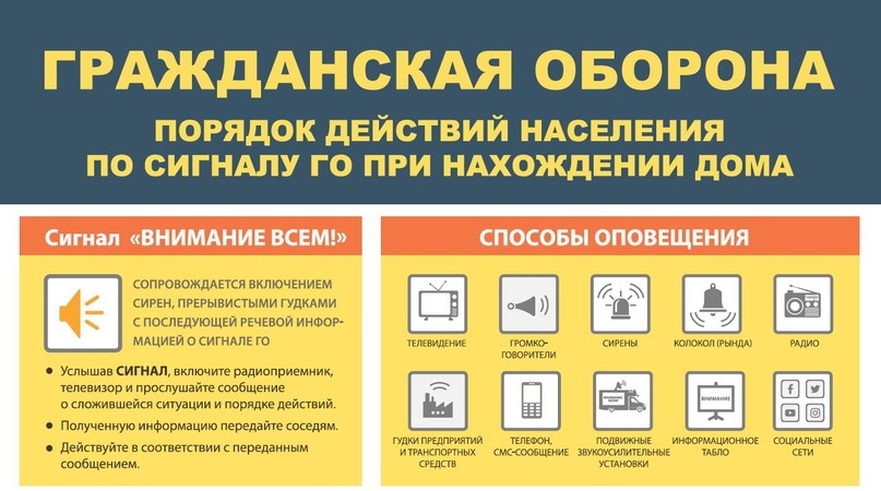 Если Вы находитесь дома, на работе, в общественном месте и услышали звук сирены или звуковой сигнал «Внимание всем», то немедленно включите радио («Маяк», «Радио России») и/или включите телевизионный приемник на общедоступный новостной канал.