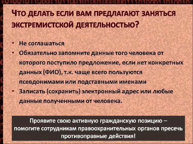 Экстремизм - это приверженность к крайним взглядам, позициям и мерам в общественной деятельности, выражается в различных формах, начиная от проявлений, не выходящих за конституционные рамки, и заканчивая такими острыми и общественно опасными формами, как провокация беспорядков, гражданское неповиновение, мятеж, повстанческая деятельность, террористические акции.