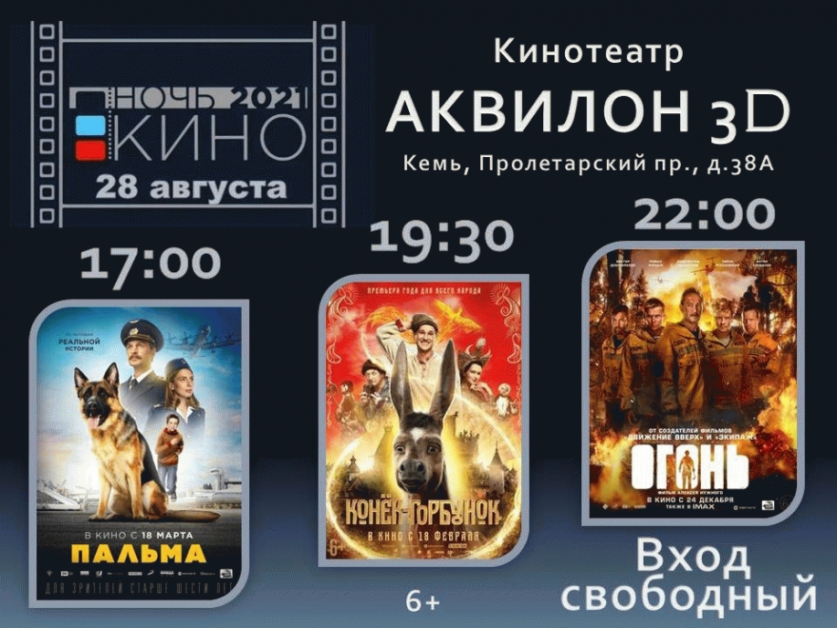 Вход бесплатный. При посещении кинотеатра просим соблюдать требования Роспотребнадзора.