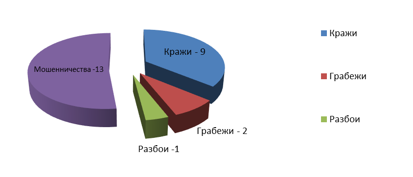 Сократилось количество преступлений совершенных путем кражи на 72,7% (с 33 до 9). На долю указанных хищений приходится 13,8% от всех выявленных преступных деяний.