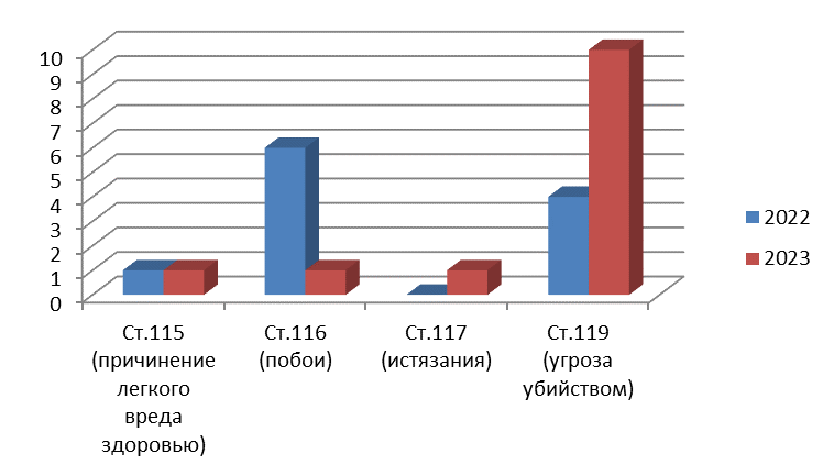 По сравнению с аналогичным периодом прошлого года, на 20% увеличилось число преступлений направленных против личности – 30 (3 мес.2022 г. – 25), раскрываемость данной категории преступлений составила 93,1 %. За 3 месяца 2023 года зарегистрировано 10 фактов угрозы убийством, 1 факт побоев, 1 факт истязания, 1 факт причинения легкого вреда здоровью.