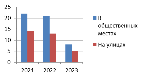 Оперативная обстановка обслуживания ОМВД России по Кемскому району за 3 месяца 2023 года характеризуется снижением на 61,9% числа преступлений, совершенных в общественных местах (с 21 до 8), удельный вес в общем массиве зарегистрированных преступлений составил 12,3%, раскрываемость указанной категории преступлений составила 100%. Количество преступлений, совершенных в общественных местах, небольшой и средней тяжести составило – 6 (за 3 мес.2023 г. – 19), тяжкие и особо тяжкие – 2 (за 3 мес.2023 г. – 2).