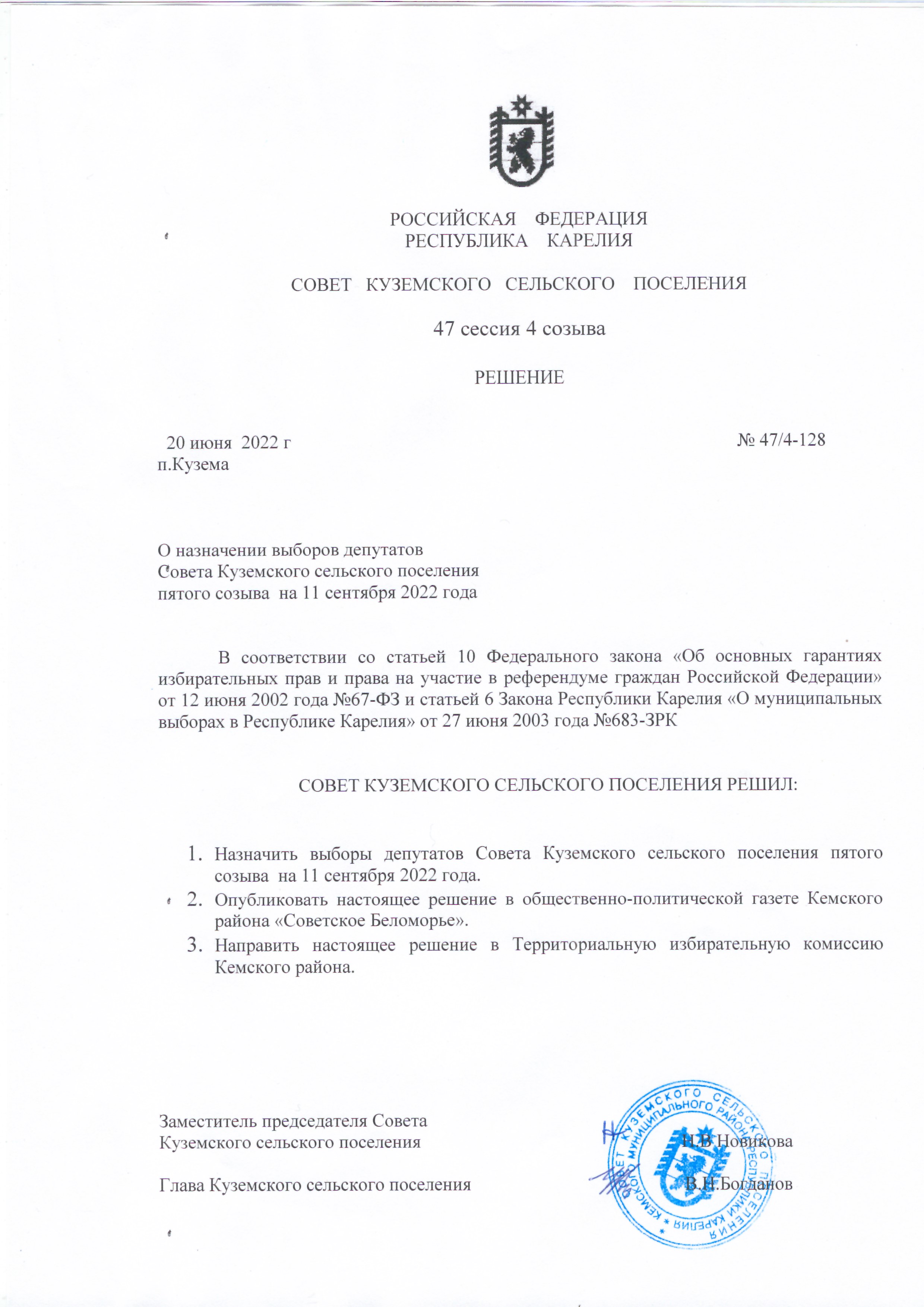 О назначении повторных выборов в Совет Кемского городского поселения пятого созыва по одномандатным избирательным округам № 12, №15 |